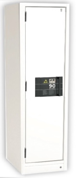 Bezpečnostní skříň na hořlaviny Köttermann s požární odolností 90 minut (FWF90 - dle EN 14470-1), vysoká - jednokřídlá dveře vlevo (uzamykatelné), 3 police 440x432x30 mm (nosnost police 75 kg), 1 záchytná vana 417x432x130 mm (objem 22 litrů), odtahové hrdlo prům.75 mm (min.objem odvád.vzduchu 4,1 m3/h), hmotnost skříně 265 kg.