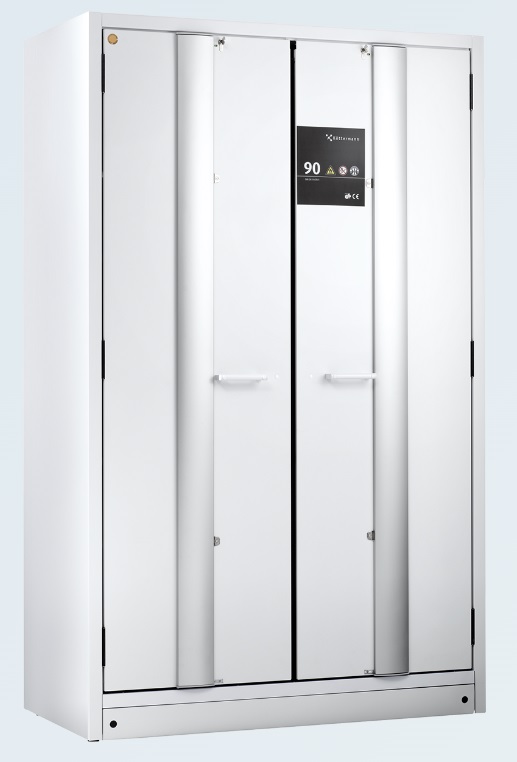 Bezpečnostní skříň na hořlaviny Köttermann s požární odolností 90 minut (FWF90 - dle EN 14470-1), vysoká - se skládacími lamelovými dveřmi dvoudveřová (uzamykatelná), 3 police, 1 záchytná vana, odtahové hrdlo prům.75 mm, hmotnost skříně 470 kg.