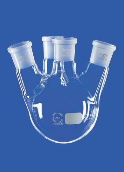 Baňka destilační, čtyřhrdlá, 250 ml, 1x 29/32, 3x 29/32 šikmý tubus (15°)