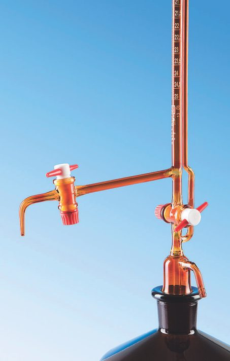 - hnědé sklo, modrá graduace, skleněný výpustný kohout (zobrazení A), bez Schellbachova pruhu, bez zásobní lahve a balónku